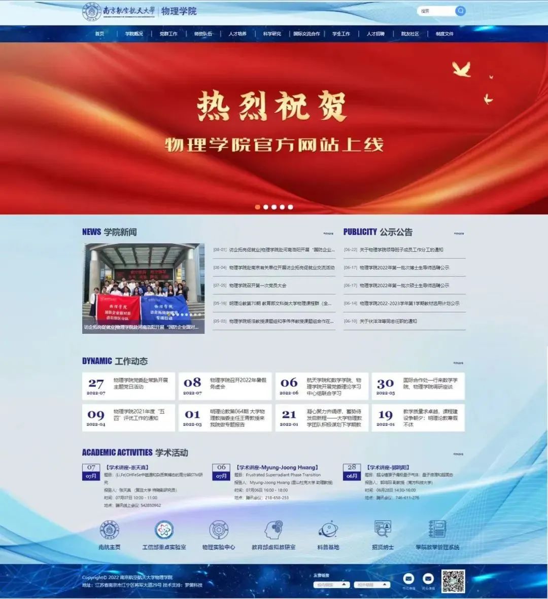 新国产福利 ,新气象。在前期充分调研和广泛征求意见的基础上,国产福利 于6月下旬启动了官方网站的建设工作,经过几轮设计修改、编程测试及内容更新,国产福利 官方网站即日起正式运行。国产福利 官方网站主色调采用南航蓝,融入物理与空天特色。网站包含国产福利概况 、党群工作、师资队伍、人才培养、科学研究、国际交流合作、学生工作、人才招聘、院友社区和制度文件等十个栏目,全面细致地展示了国产福利 的全新的风貌。