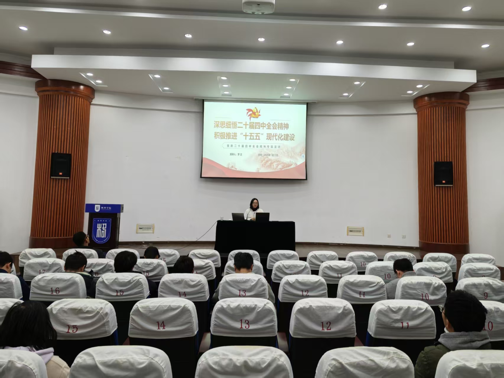 1月15日,国产福利 举行学习贯彻党的二十届四中全会精神校内宣讲团报告会。国产福利 全体教职工、学生党员参加报告会,会议由国产福利 党委副书记、院长陈金宝主持。