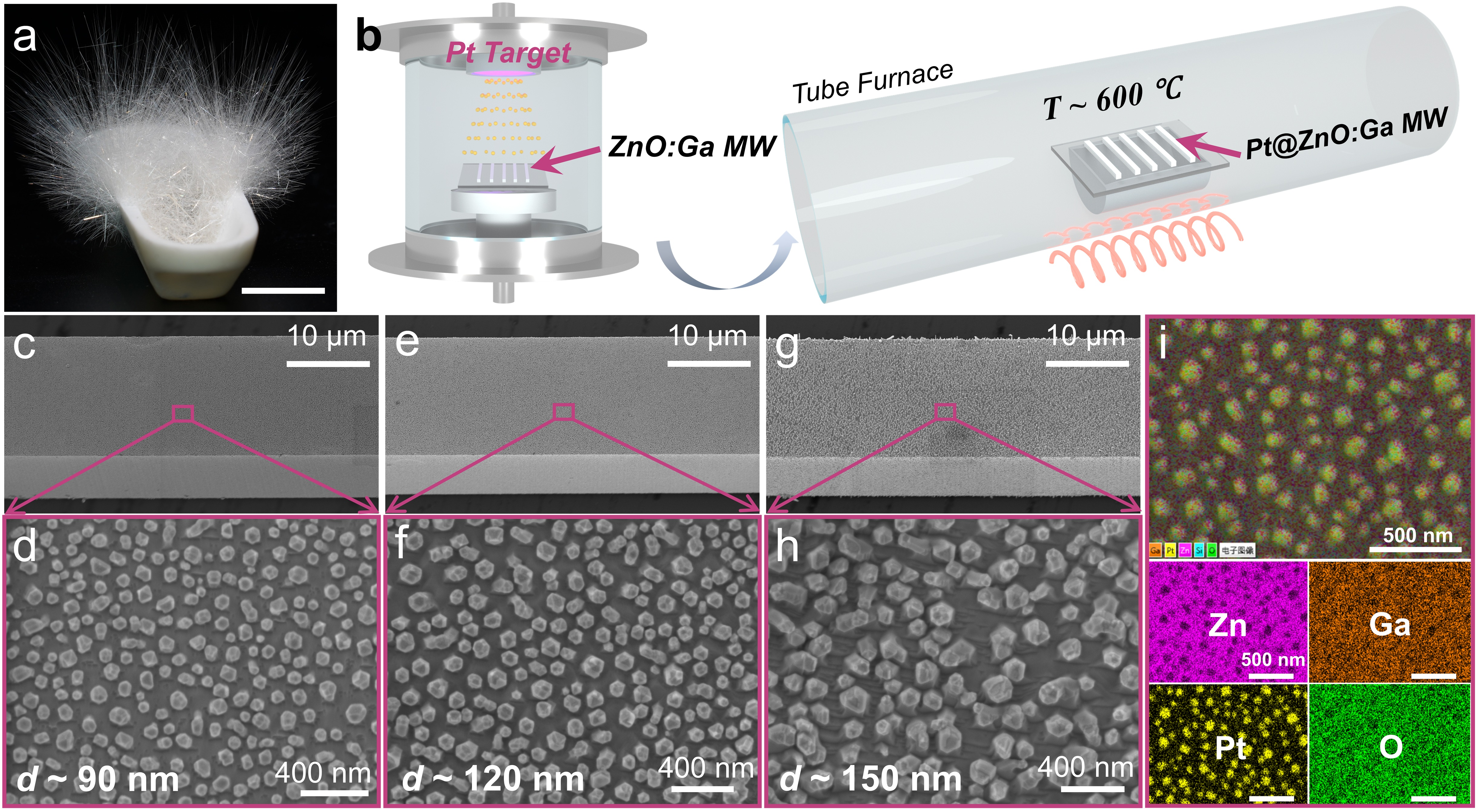 图1:PtNPs@ZnO:Ga复合结构的制备及基础表征。(a)ZnO:Ga微米线的光学照片,(b)PtNPs@ZnO:Ga复合结构制备流程示意图,(c-h)PtNPs@ZnO:Ga复合结构扫描电子显微镜图像,(i)元素分布图。