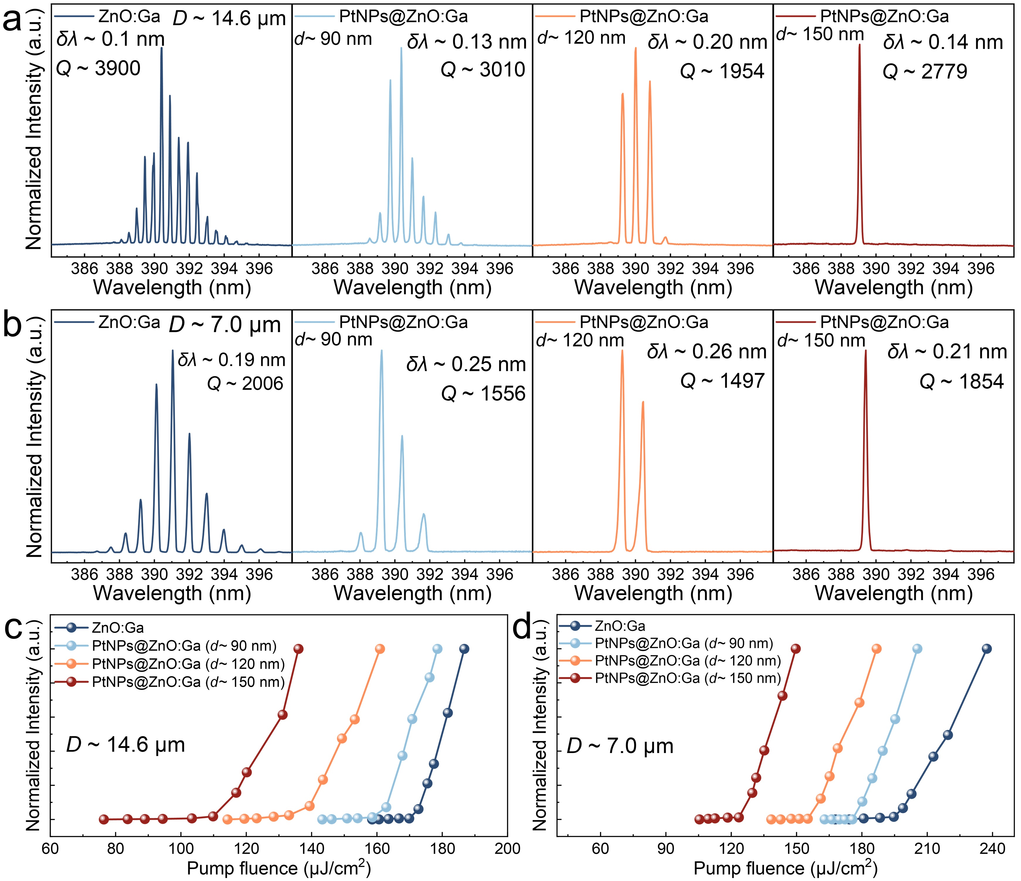 图3:不同直径ZnO:Ga微米线在PtNPs修饰前后的光泵浦激光性能。14.6 μm(a)与7.0 μm(b)的样品在PtNPs修饰前后的光泵浦激光,14.6 μm(c)与7.0 μm(d)的样品在PtNPs修饰前后的阈值分析。