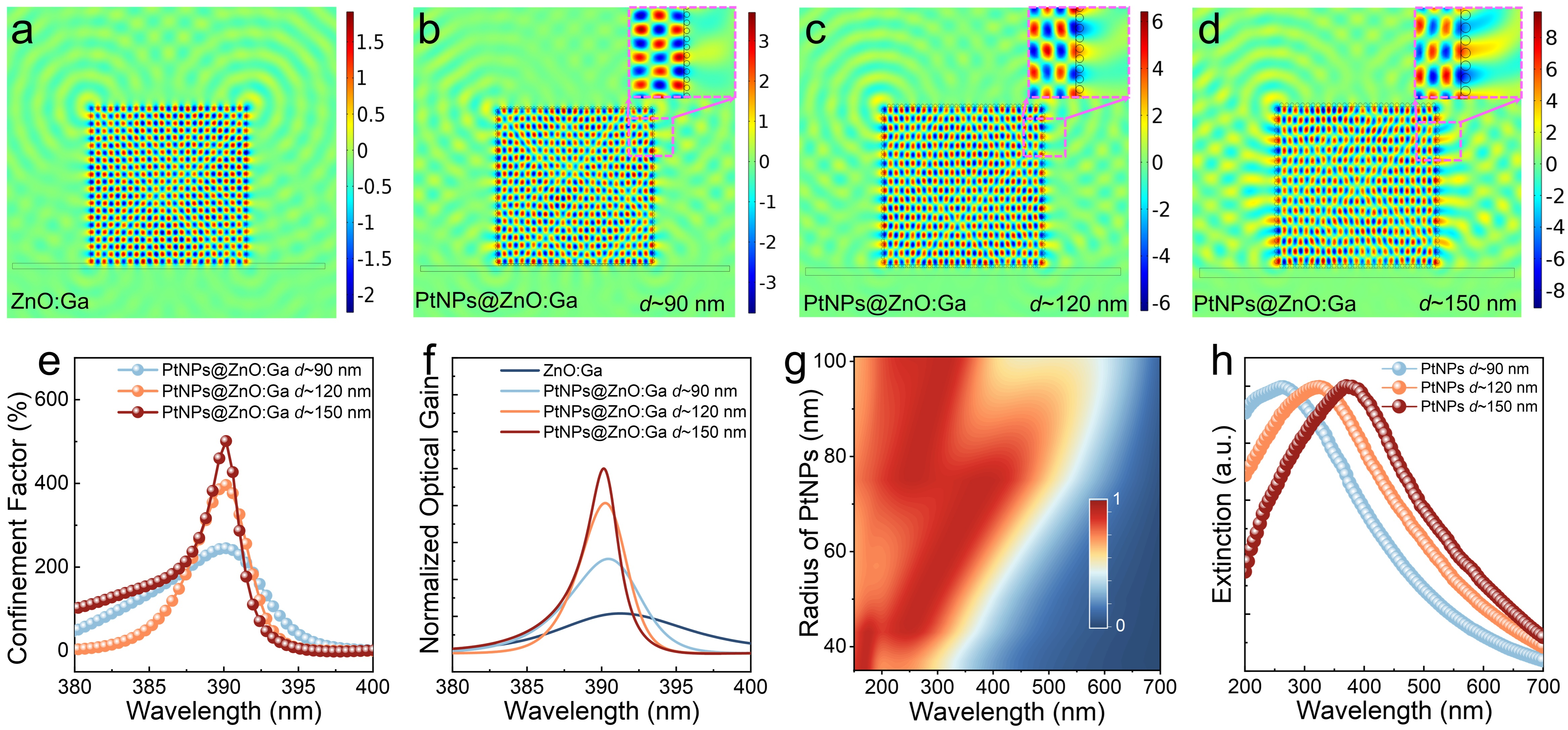 图5:PtNPs修饰前后ZnO:Ga微米线的模式调控分析。(a-d)PtNPs修饰前后ZnO:Ga微米线的电场分布模拟,(e-f)PtNPs修饰前后ZnO:Ga微米线增益光谱调控,(g-h)PtNPs吸收光谱的模拟及实验值。
