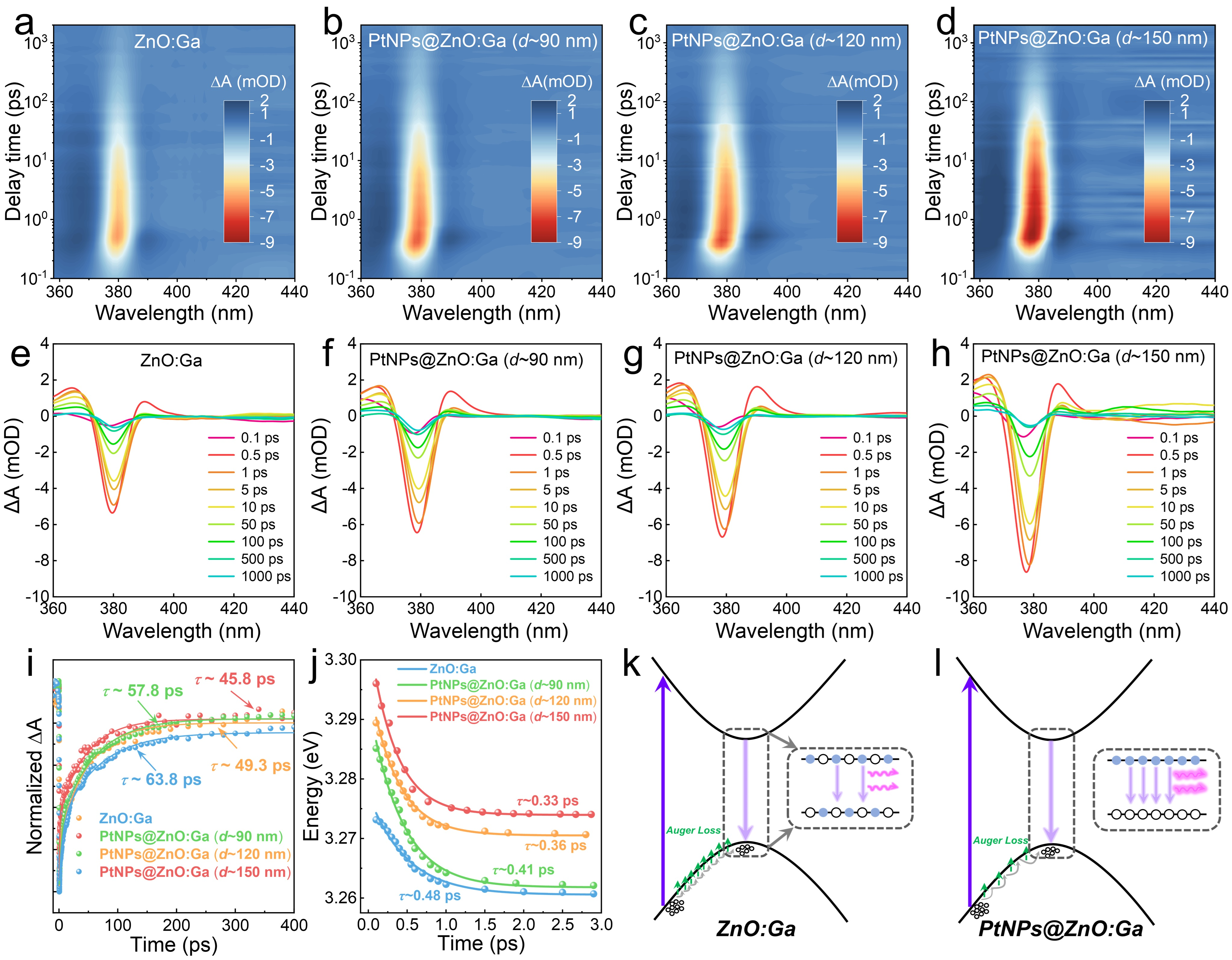 图4:PtNPs修饰前后ZnO:Ga微米线的载流子动力学分析。(a-d)PtNPs修饰前后ZnO:Ga微米线的瞬态吸收光谱mapping,(e-h)PtNPs修饰前后ZnO:Ga微米线在不同延迟时间下的瞬态吸收光谱,(i-l)PtNPs修饰前后ZnO:Ga微米线的热载流子冷却过程分析。