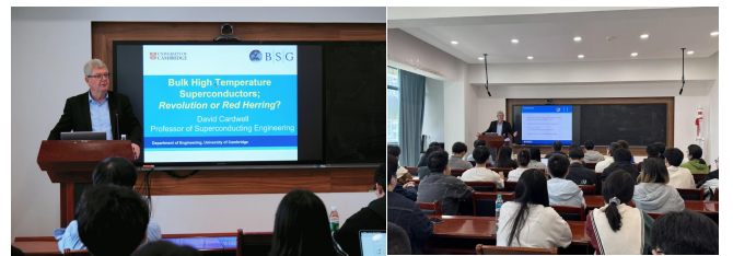 Cardwell教授围绕超导体的基本特性、演进历程及工程应用前景展开了系统讲解。他从超导电性的首次发现入手,深入浅出地阐释了该领域的两大核心现象:零电阻效应与完全抗磁性。随后,Cardwell教授介绍了高温超导铜氧化物材料的发展脉络,并结合最新研究成果,详细阐述了在块体高温超导材料中实现高临界电流的制备工艺及其潜在的工程价值。通过磁悬浮、储能装置、磁共振成像以及高场磁体等多个具体实例,他生动展示了超导技术的广阔应用前景。Cardwell教授精彩的报告极大激发了在场师生对超导应用研究的热情.